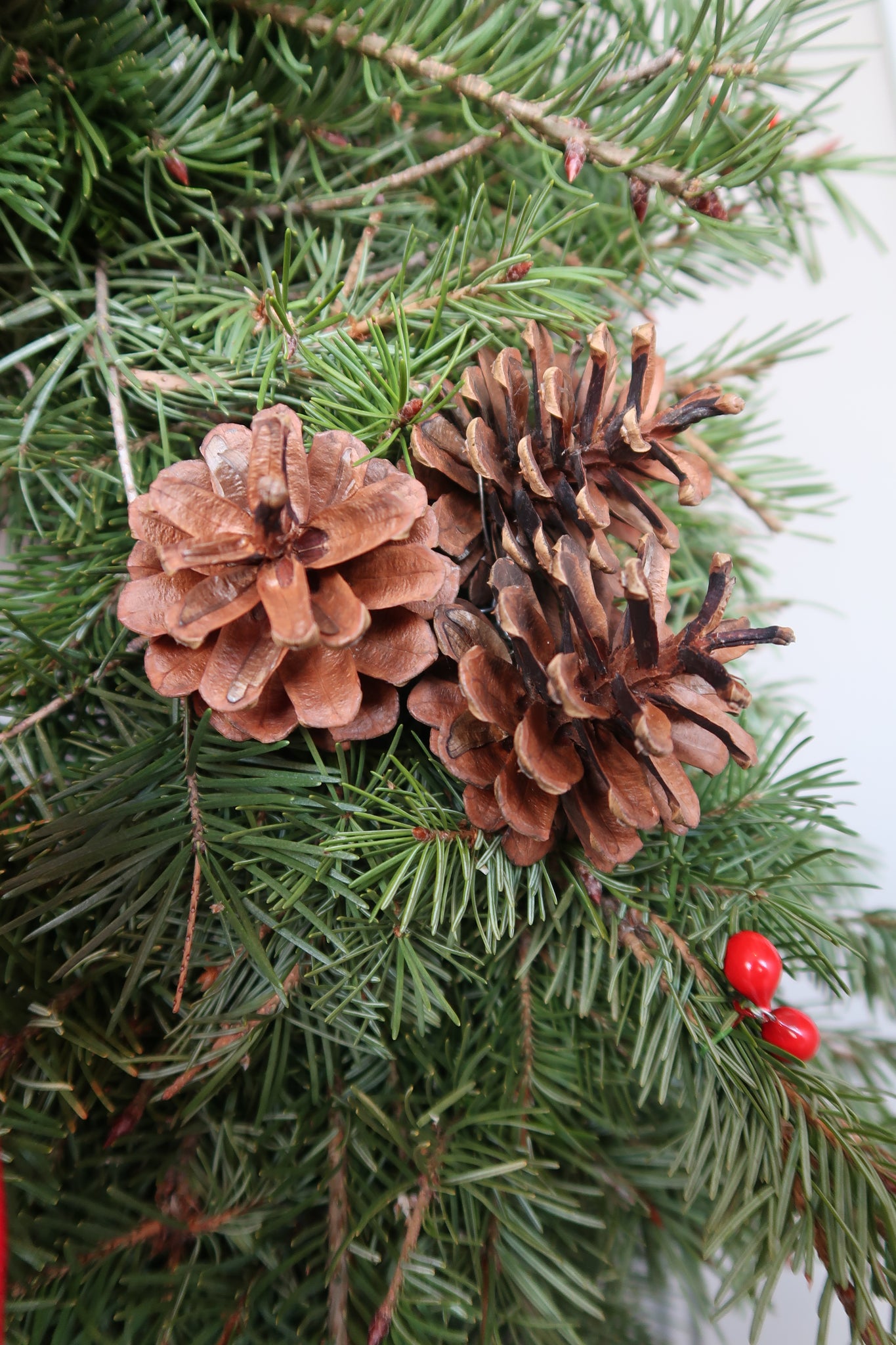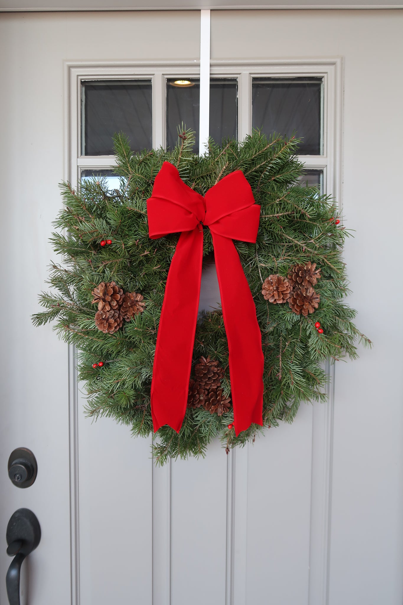This 24 inch wreath is decorated with a red velvet bow, holly berries, and your choice of clusters of frosted or natural cones.
