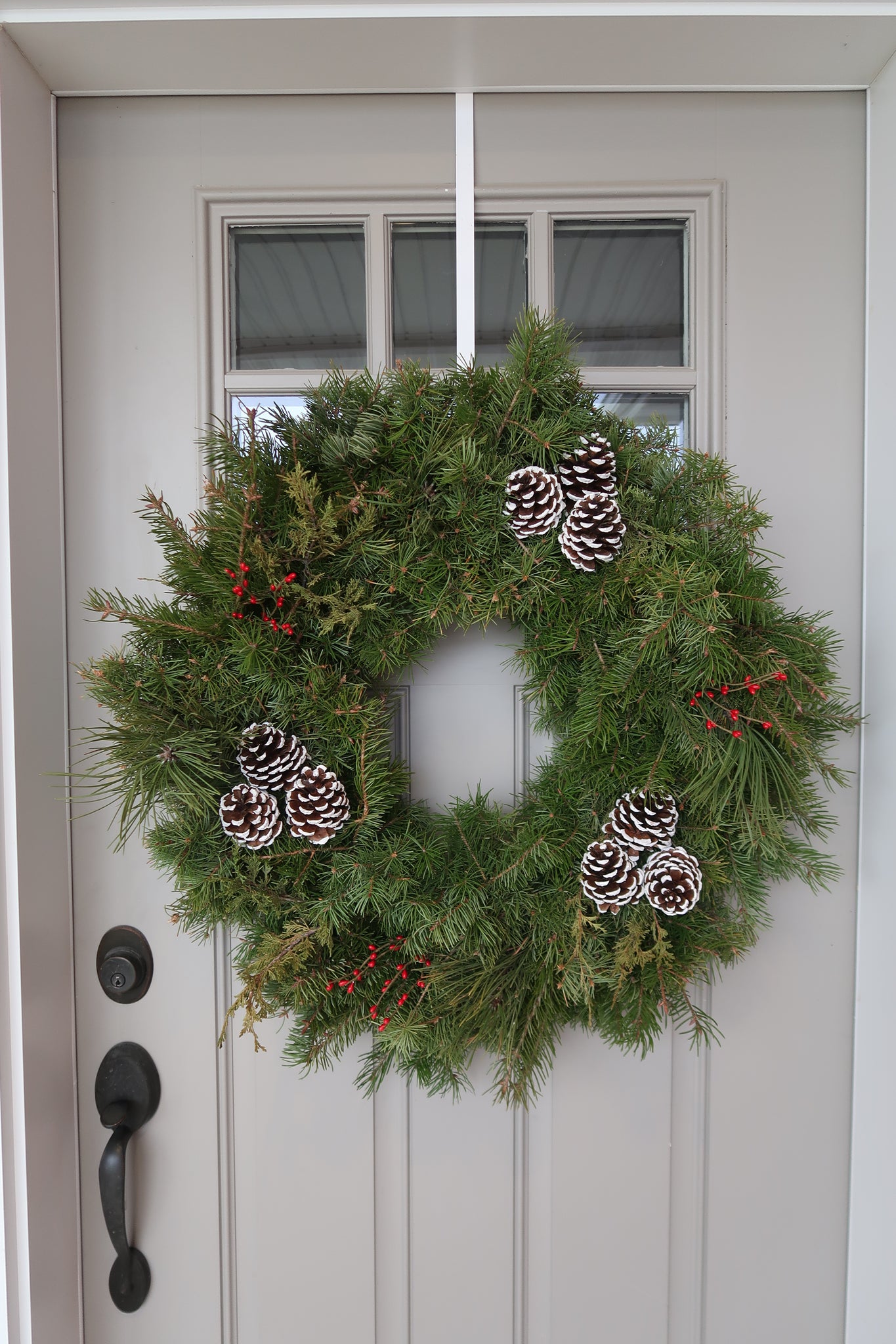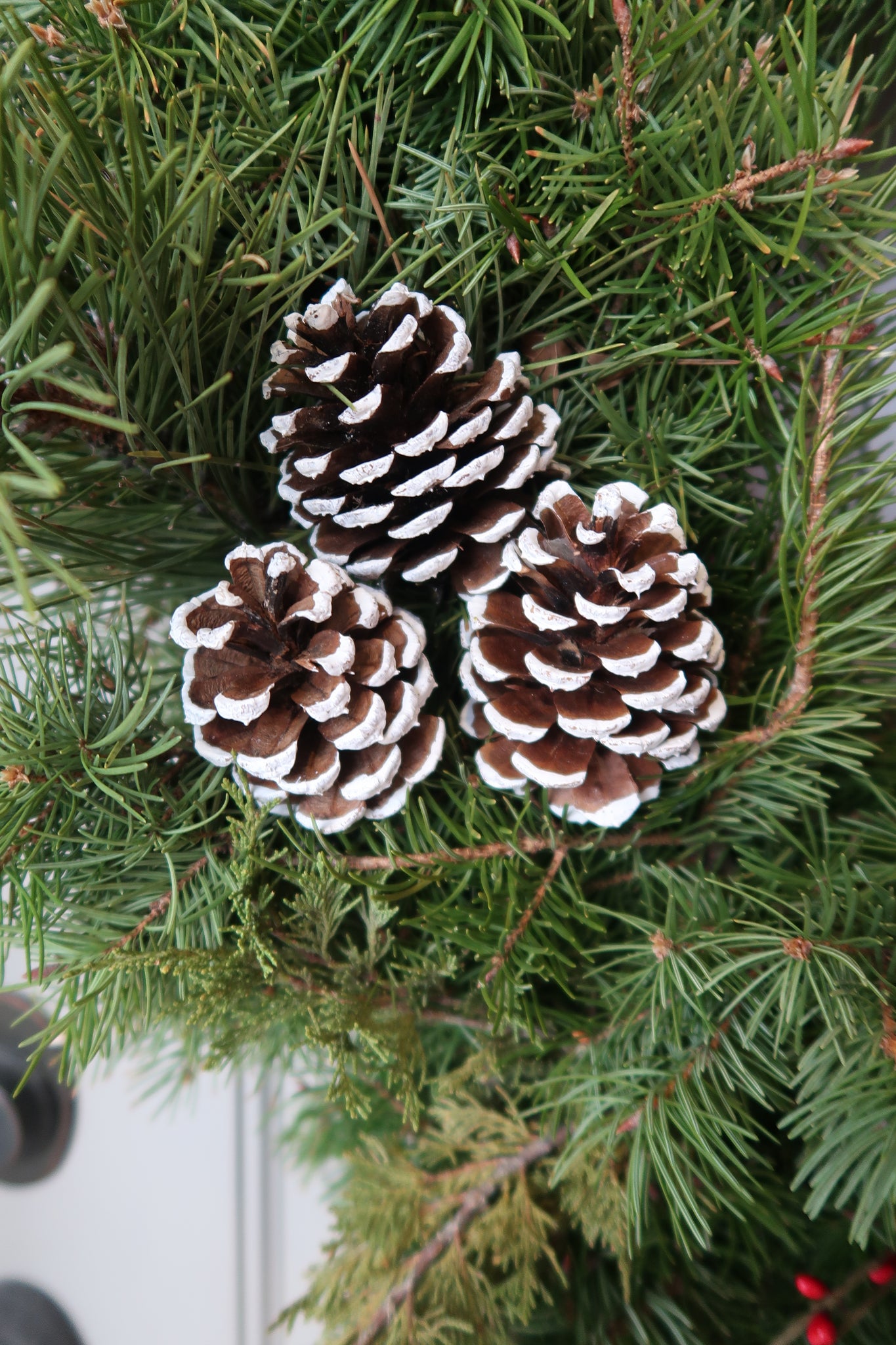 This 32 inch wreath has a mix of Douglas Fir, Juniper Cedar, Ponderosa Pine, red berries and it comes with your choice of natural or frosted pine cones.